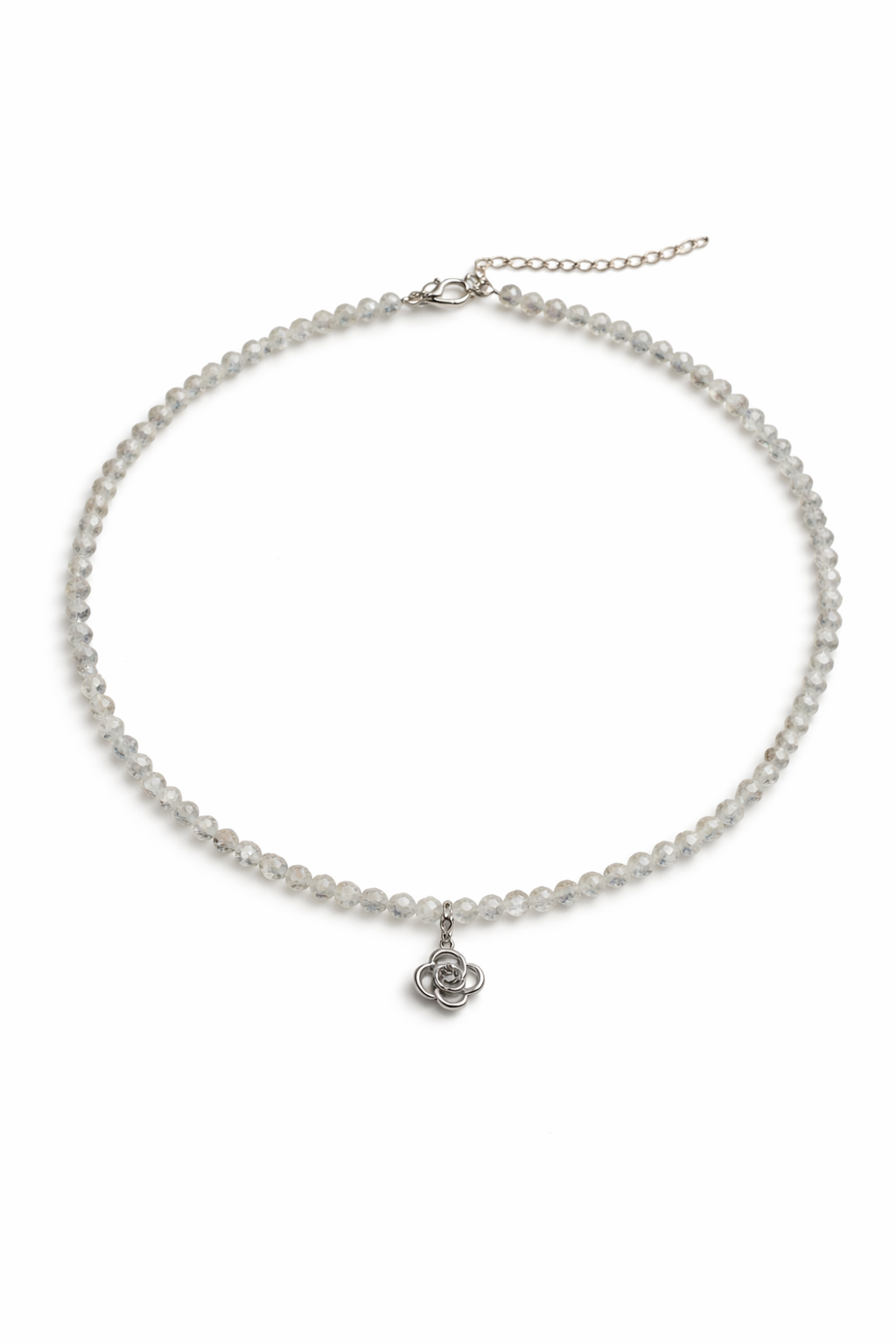 Precioso collar Flor en topacio incoloro facetado de 3mm. La flor es en acero inoxidable plata. Es una pieza ideal para lucir sola o combinada con otros collares.