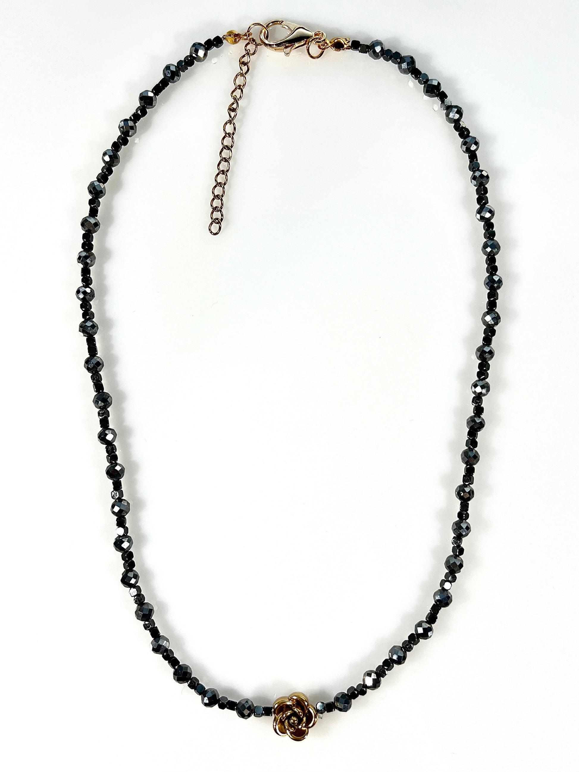 Collar Flor realizado en hematites negros de diferente tamaño. La flor es dorada de acero inoxidable.