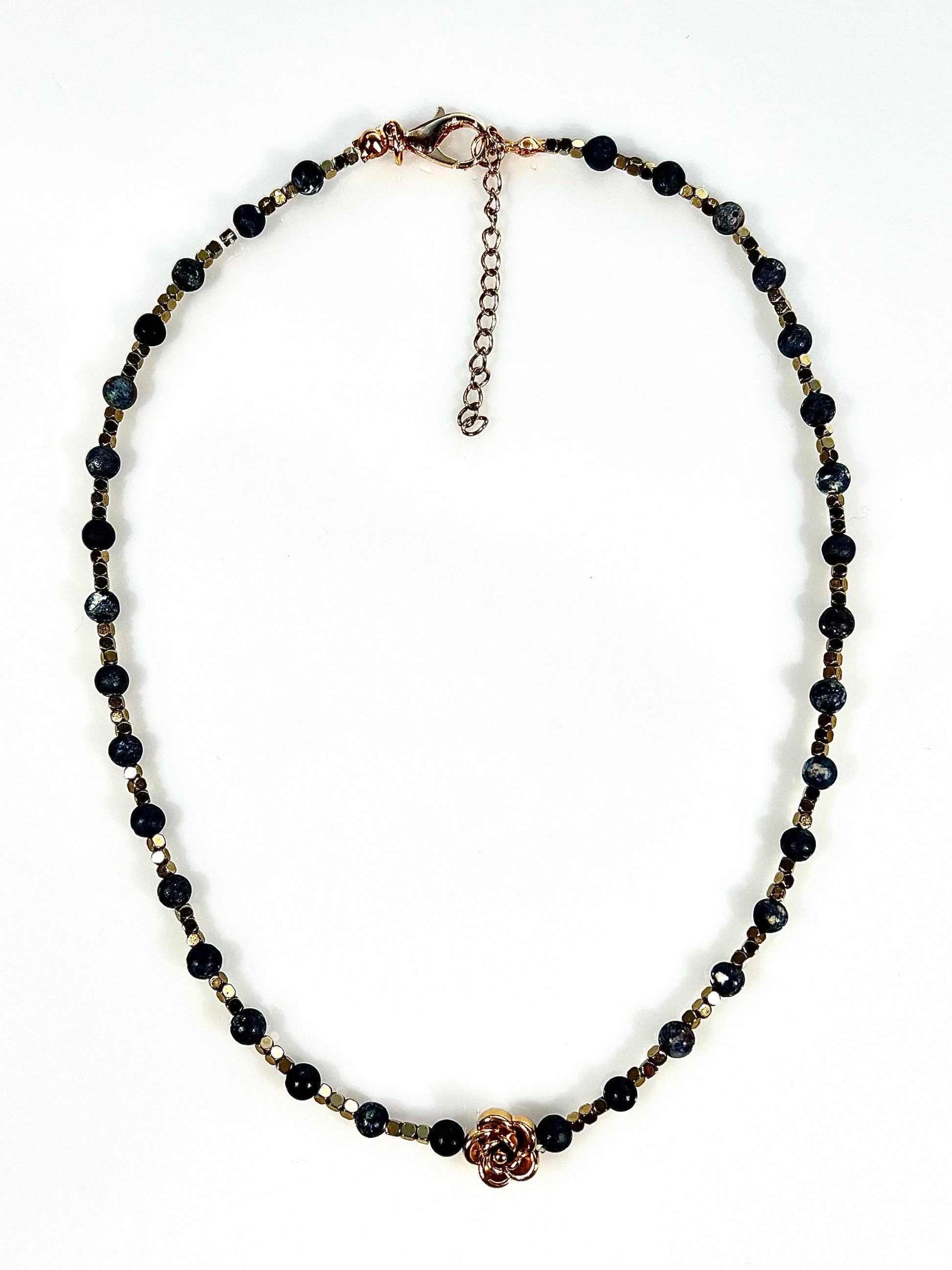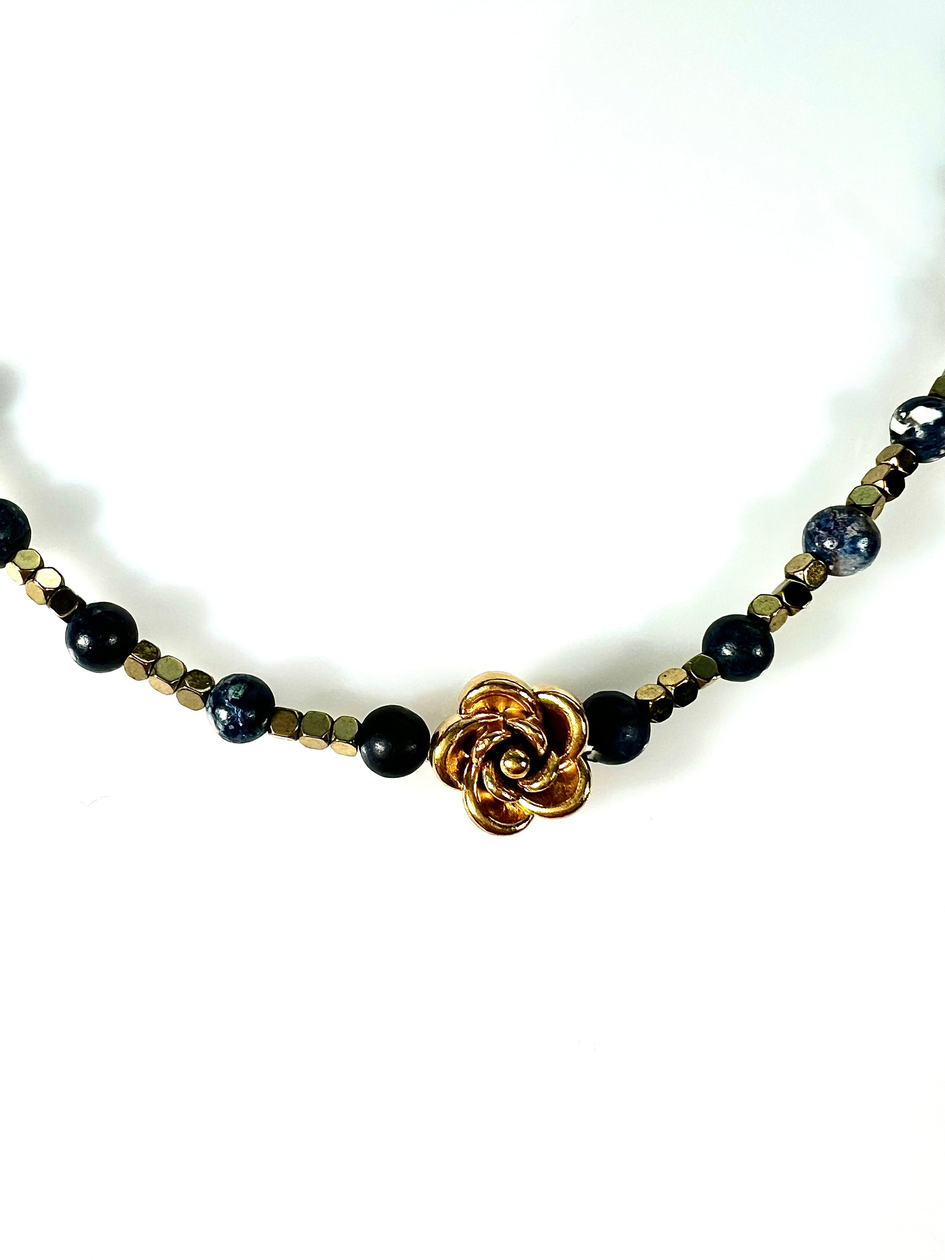 Collar Flor realizado en hematites dorados y turquesas americanas. La flor es dorada de acero inoxidable.