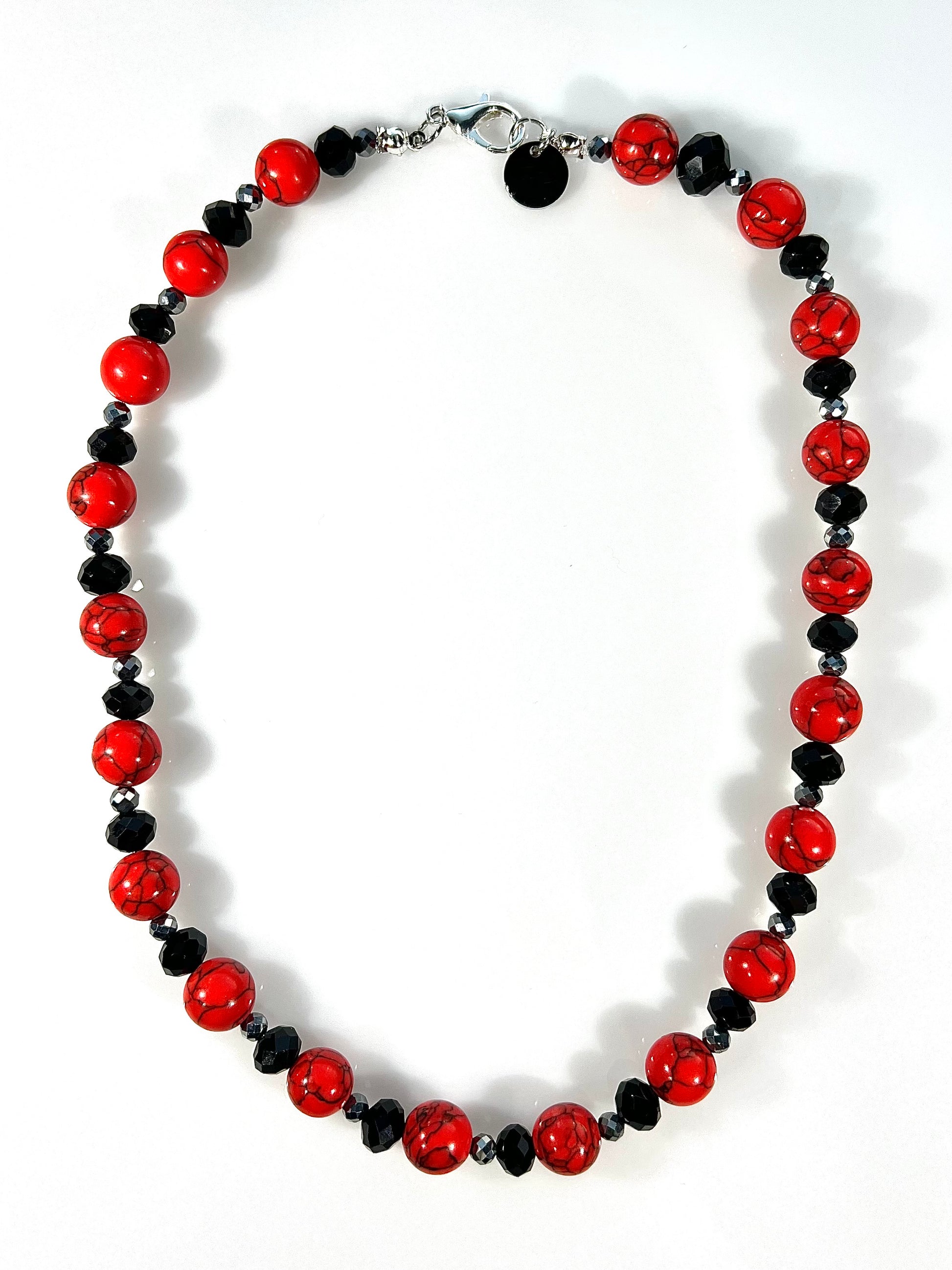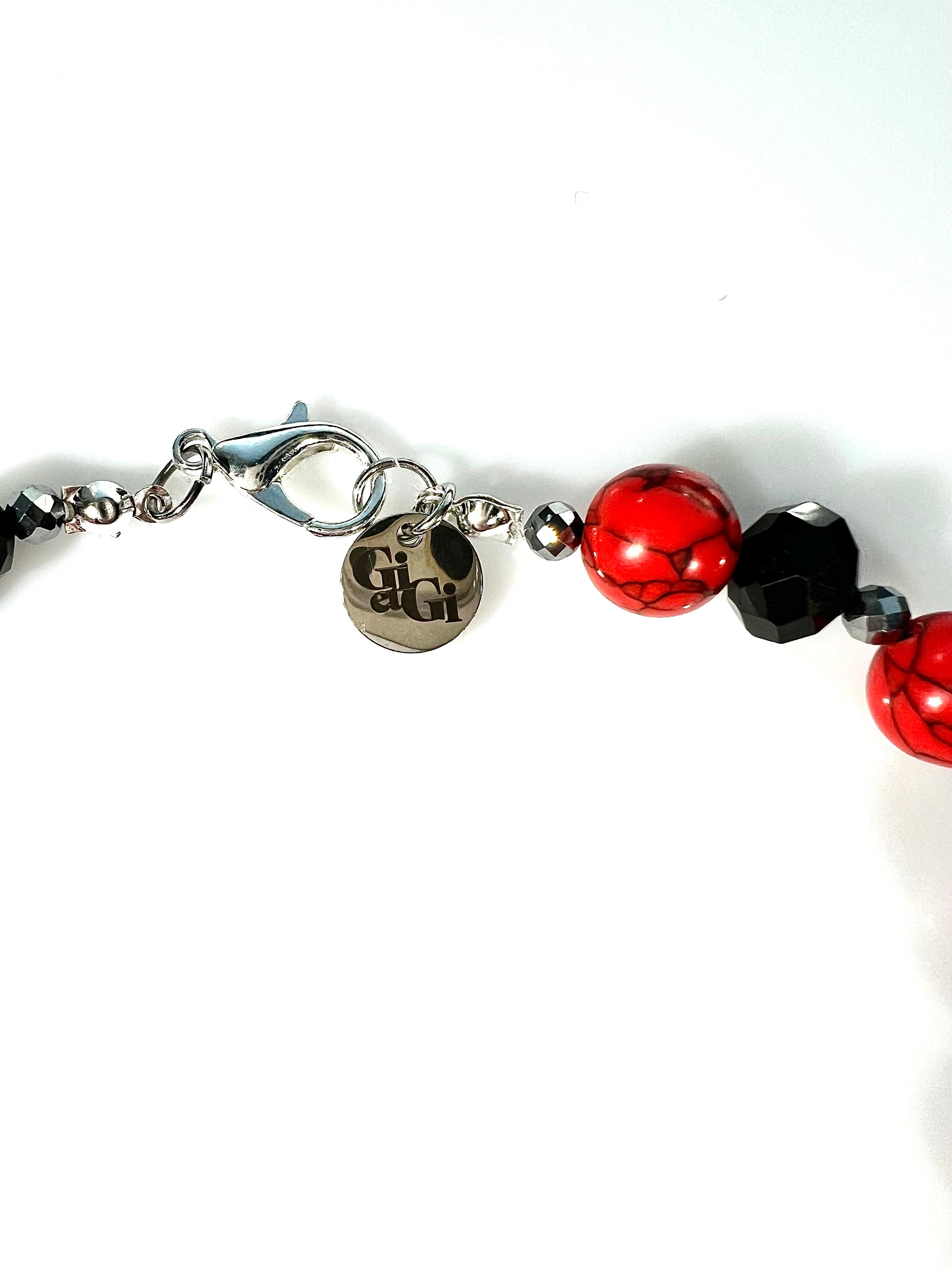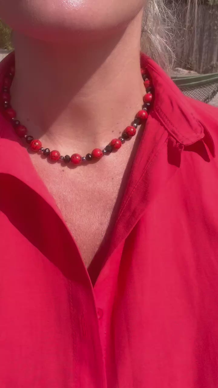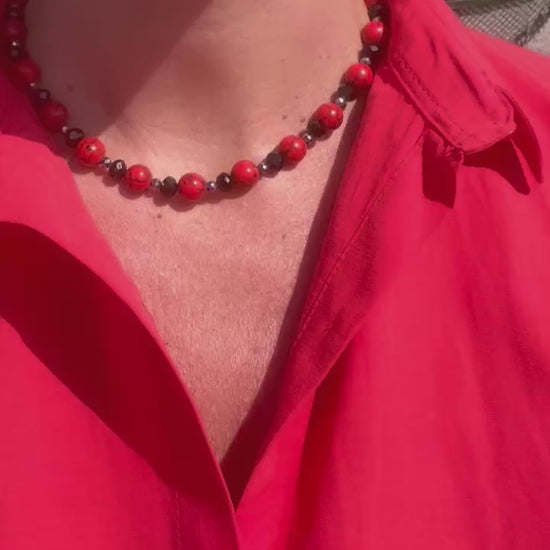 Collar realizado en turquesa roja, hematites negros y resina facetada.