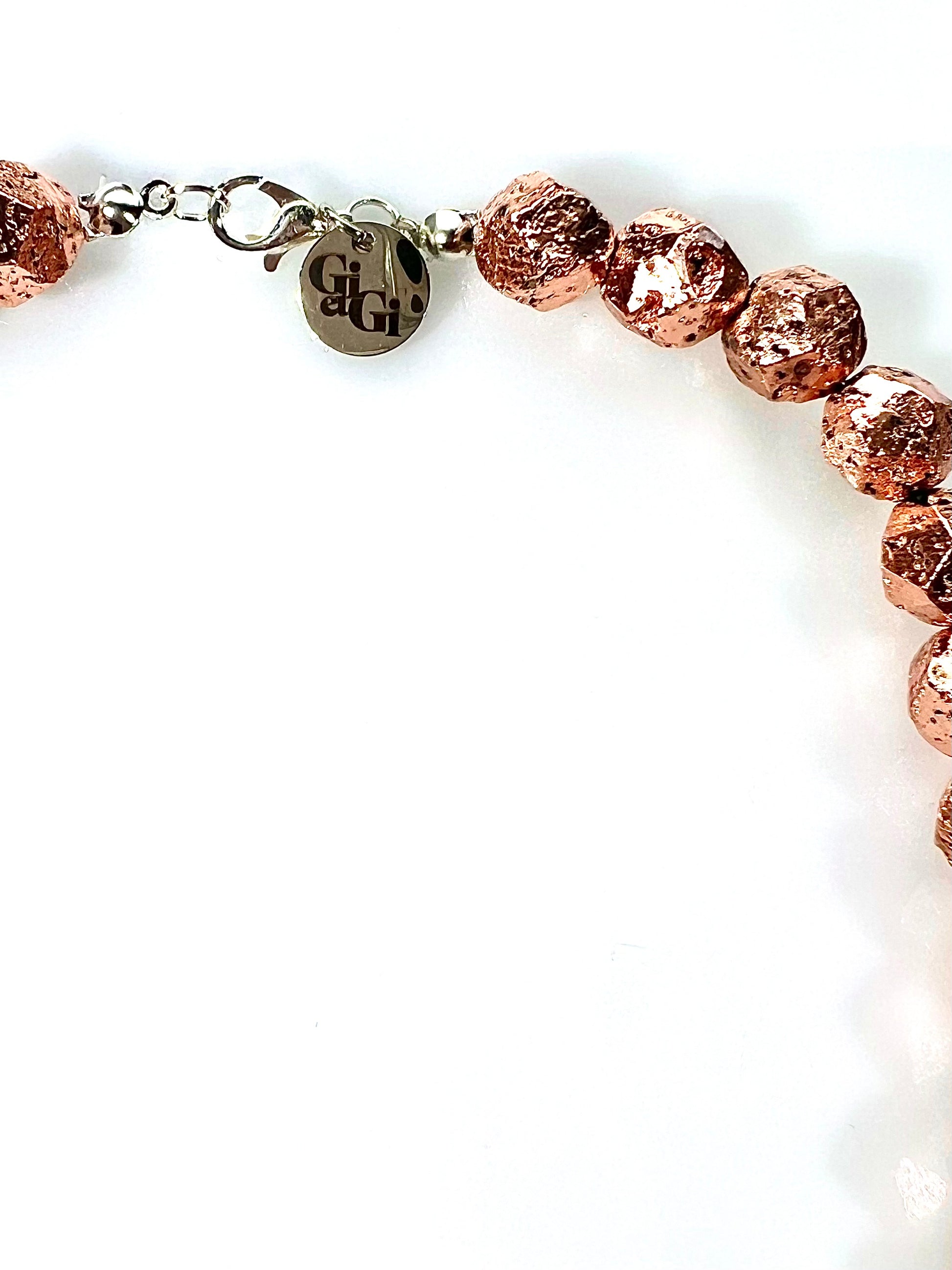 Collar en Lava dorada, exclusivo de nuestra colección GietGi. Pieza hecha a mano con piedras volcánicas en dorado rosa. Es un collar muy versátil, muy especial y muy decorativo.